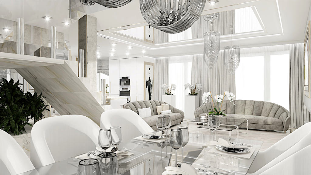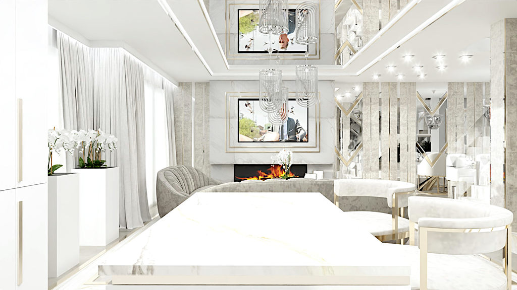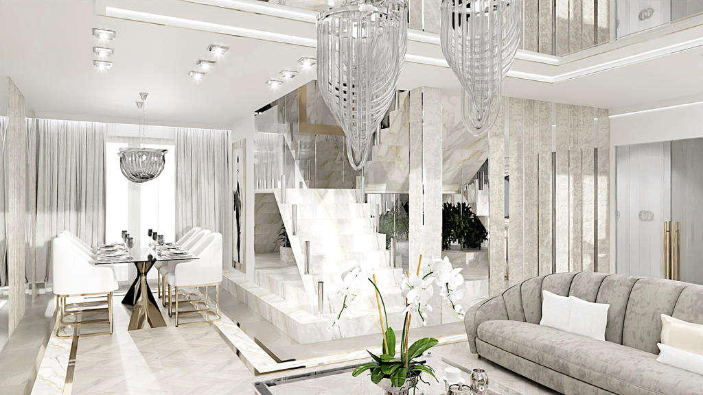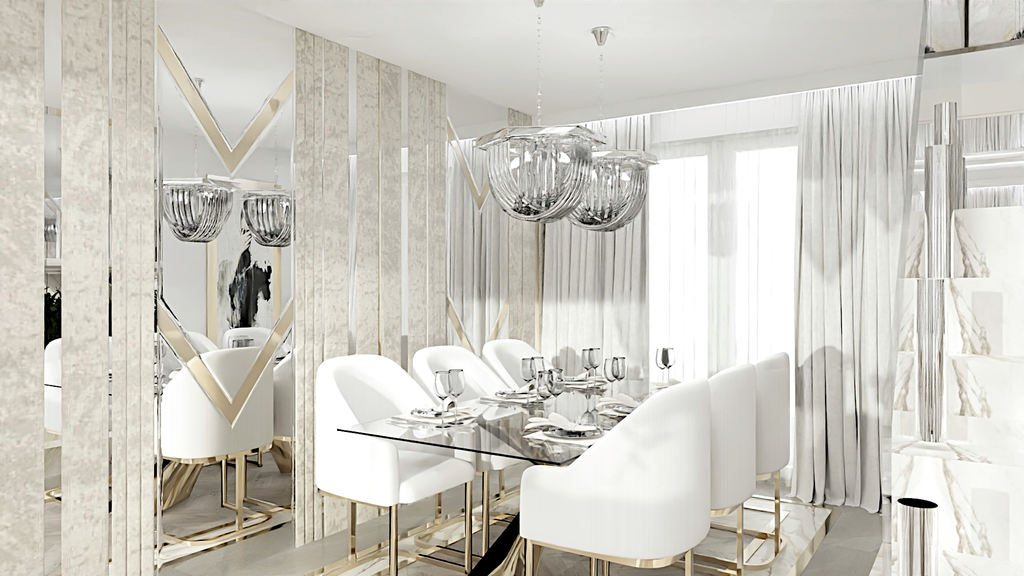 W drugiej części projektu wnętrz domu pokazujemy z bliska jadalnię. Elegancja, lekkość i harmonia to najważniejsze cechy tych luksusowych wnętrz. Jakość aranżacji wnętrza wyraża się w dopracowanym detalu, równowadze kompozycji wszystkich elementów i konsekwentnym doborze materiałów.