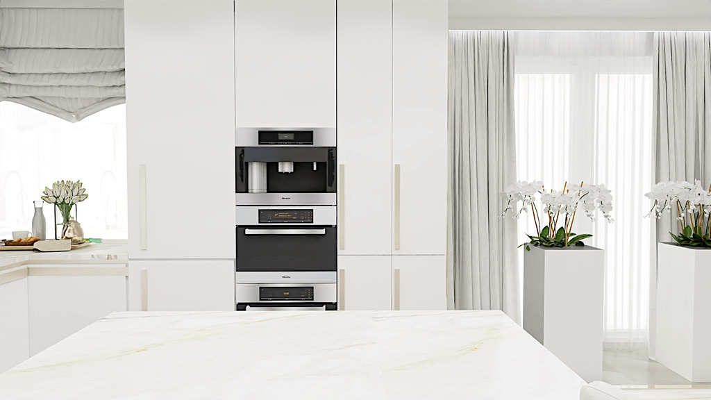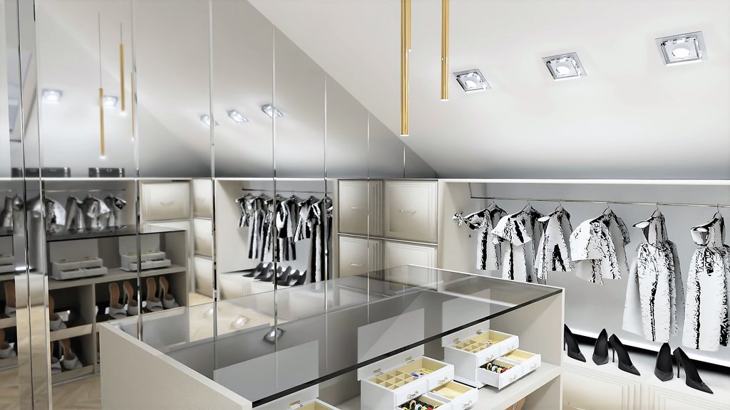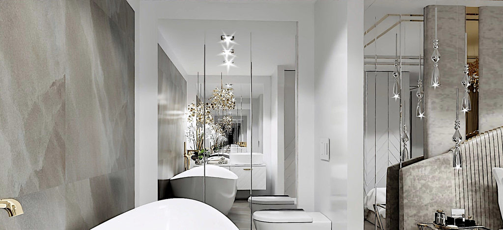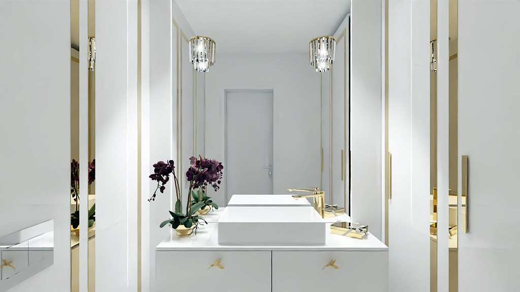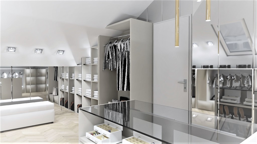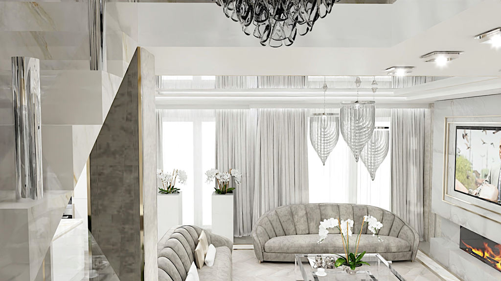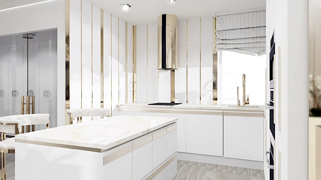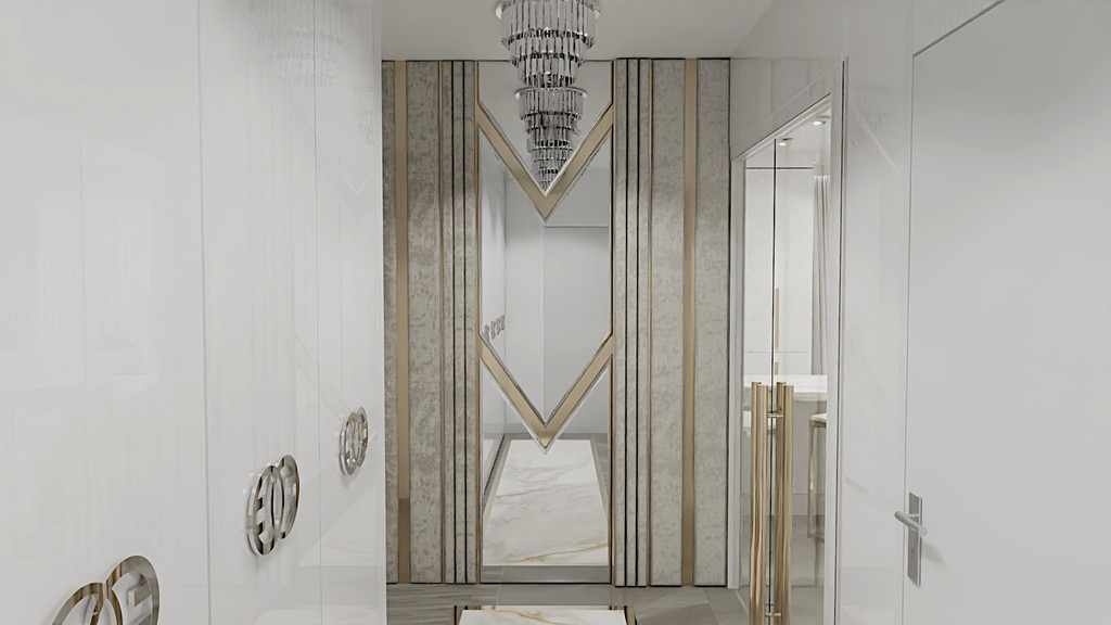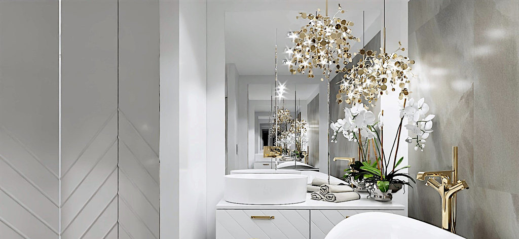 Elegancka i ponadczasowa kolorystyka oraz materiały, efektowne faktury, wiele powierzchni z połyskiem – lustra, szkło, lacobel czy lakierowane płyty meblowe kamień naturalny – budują wrażenie luksusu i wyjątkowości. Piękny parkiet w salonie i jadalni oraz subtelne dodatki w kolorze złota dodają wnętrzom wytwornej elegancji i ciepła.