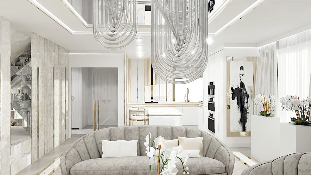 Nowoczesne kompozycje w części dziennej domu wniosły oprócz luksusu również harmonię, dzięki której wnętrza będą komfortowe dla przyszłych mieszkańców. Przestrzeń tego domu została również wykorzystana pod względem funkcjonalnym, aby dopasować ją do potrzeb i stylu życia użytkowników.