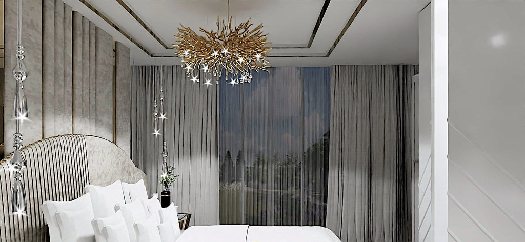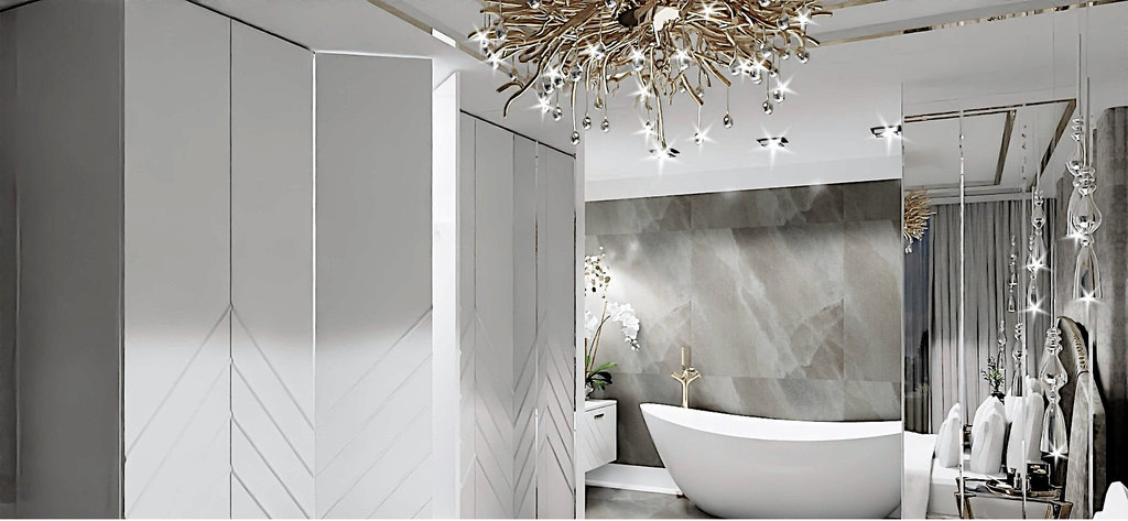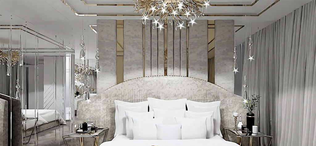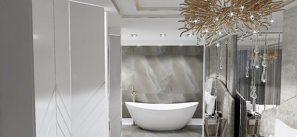 Wyjątkowa przestrzeń domu inspirowana klasycznym designem i wyrafinowanym stylem luksusowych, prestiżowych wnętrz. Zapraszamy do galerii sypialni z łazienką. Klasyczne dodatki i wykończenia nadają nowoczesnym wnętrzom luksusowy i wytworny charakter. Ciepłe beże z białymi akcentami, nastrojowe oświetlenie, przyjemne w dotyku materiały i powierzchnie odbijające refleksy świetlne – to wszystko składa się na eleganckie i relaksujące otoczenie. Sypialnia główna Pani domu – to wyjątkowe i niepowtarzalne pomieszczenie i odważne wnętrze. Jasna sypialnia z niesamowitym tapicerowanym zagłówkiem efektownie współgra z ekskluzywną łazienką. I to złoto…